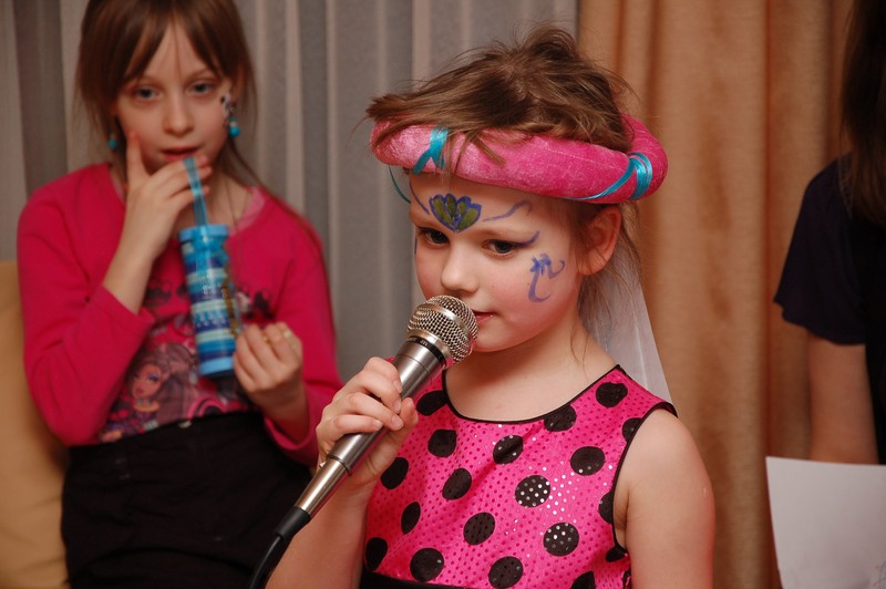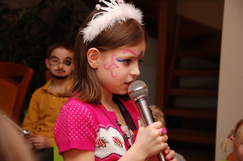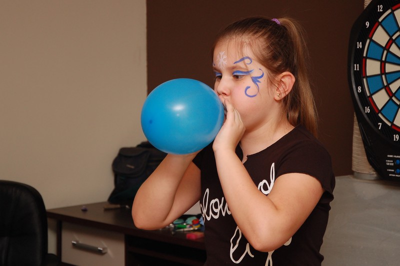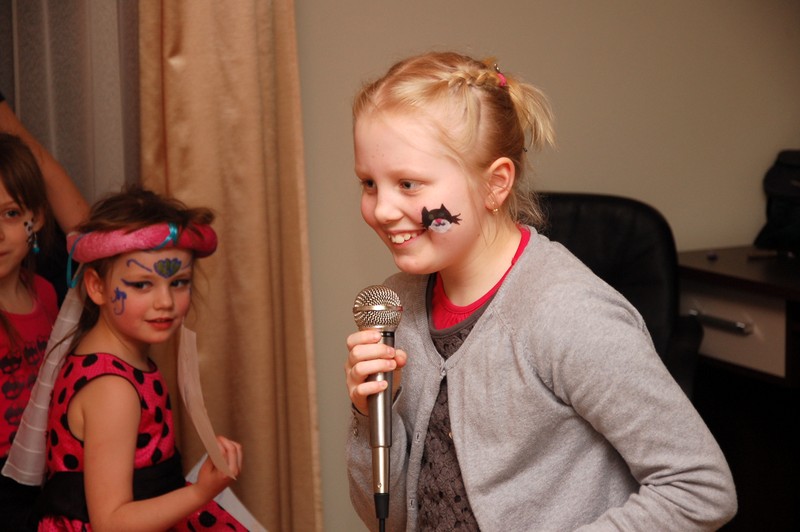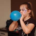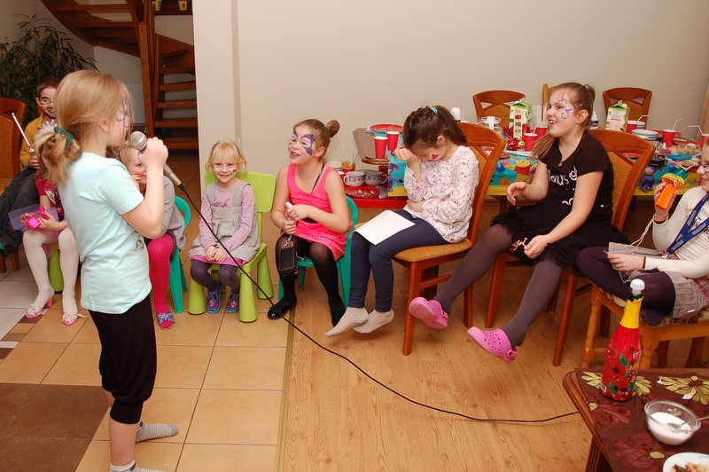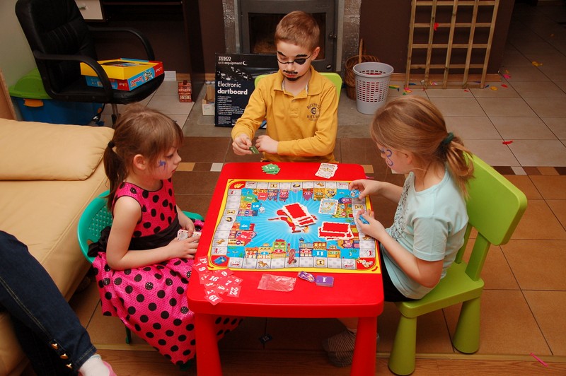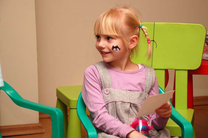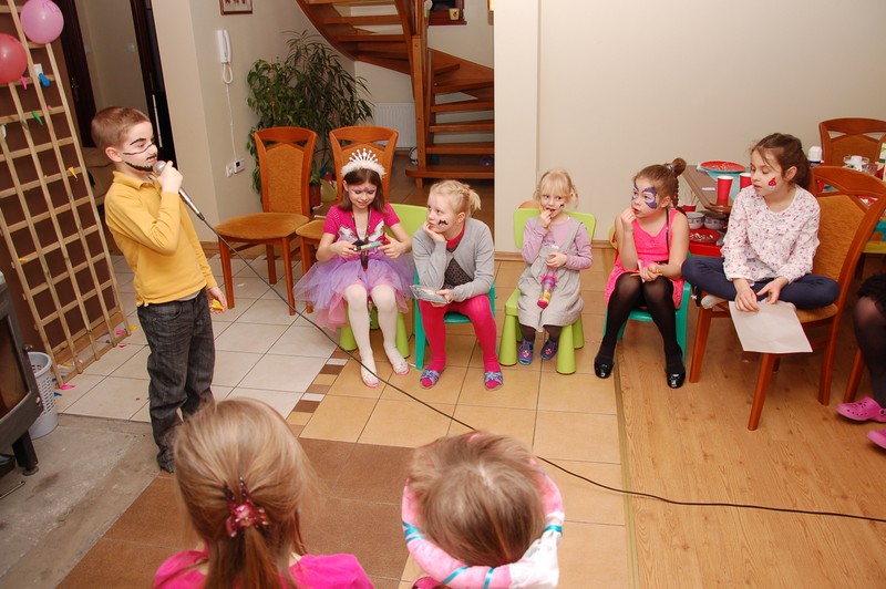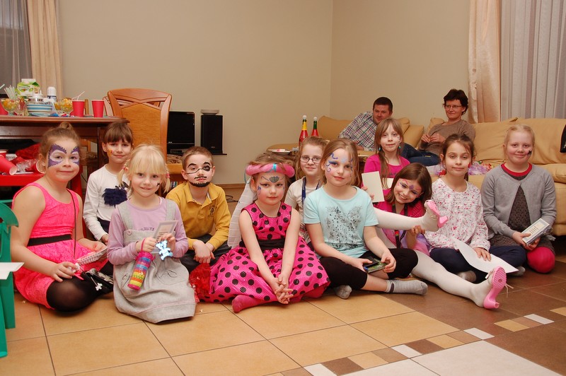 Potem był konkurs darta (rzucanie lotkami do tarczy), loteria fantowa z zadaniami i rzut piłeczkami tenisowymi do kosza. Konkursy prowadził Pawełek, podczas gdy ja usiłowałam pomalować farbami dzieciom twarze.