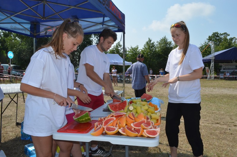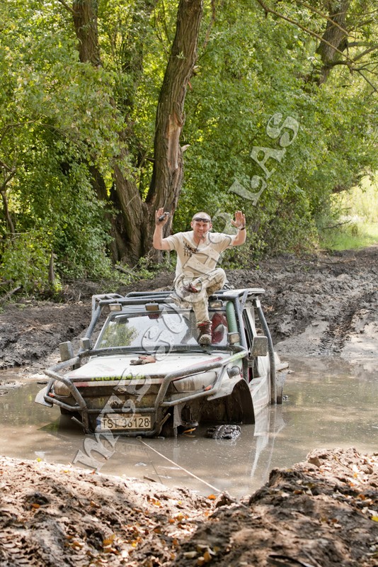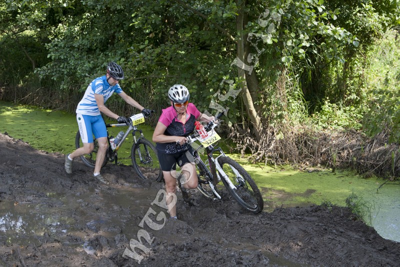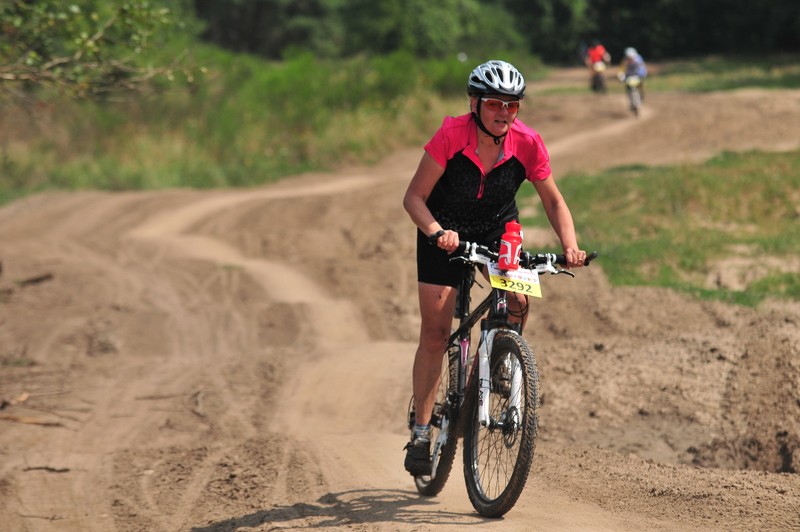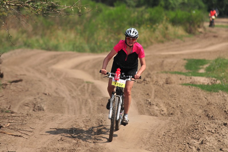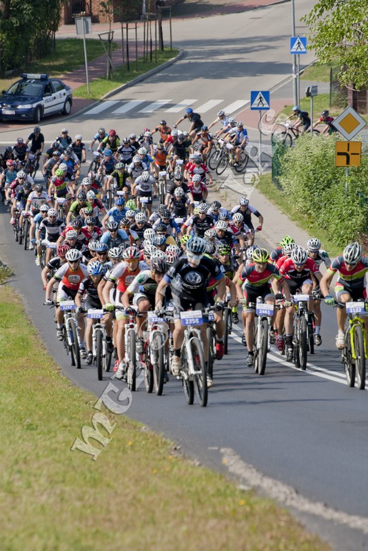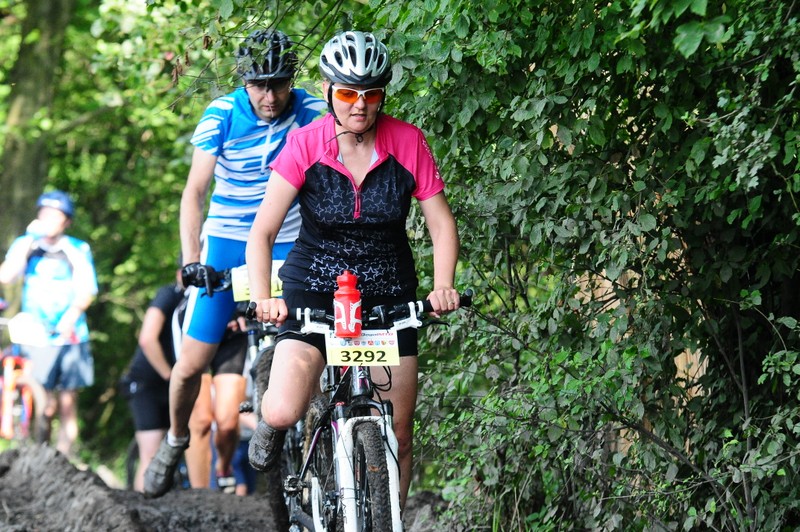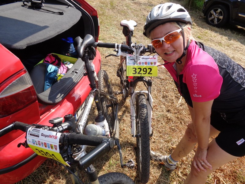 Okazało się, że najgorsze były początki. Tłum ponad 400 osób musiał „ulokować się na trasie”, co oznaczało wielki chaos, ponieważ cała chmara ludzi wystartowała w jednym momencie, nie tak jak na dotychczasowych maratonach w odstępach czasowych. W dodatku organizatorzy „zrobili ukłon” dla kobiet lokując je na starcie w III sektorze więc, mniej więcej w połowie peletonu. Już od początku tak się zestresowałam, że puszczałam wszystkich przodem. Po 8 kilometrach nabrałam większej odwagi i w końcu jechałam szybciej i szybciej. Poczułam więcej siły i powoli przesuwaliśmy się naprzód, wyprzedzając i kobiety i mężczyzn. Na pierwszym pomiarze czasu, na 13,5 km, traciłam do najlepszej zawodniczki z Teamu radia ESKA 6 minut i 36sek, a na dalszych 18 km prawie tyle samo, co oznacza, że 2 minuty i 12sek podgoniłam na 18 km (nie podaję moich „skomplikowanych” obliczeń, ale statystyka poprawiła humor :)). Ostatecznie straciłam do pierwszej zawodniczki 13 min 21 sekund. To tez mi dało do myślenia, że różnice czasowe między zawodniczkami do 3 minut są jeszcze do zniwelowania, ale ponad 10 to już „przepaść” nie do odrobienia. Co więcej przypuszczam, że te 2 minuty to dzięki Pawełkowi, bowiem na asfalcie kawałek jechaliśmy w tzw. „pociągu” prawie 38 km/h, gdzie ja takiej prędkości nawet nie osiągam jadąc samodzielnie. Dogoniliśmy wtedy grupkę dziewczyn i na wjeździe do lasu wzięliśmy ostry zakręt wyprzedzając je wszystkie. Potem, już w lesie, trzeba było mocniej pociągnąć, żeby zgubić dziewczyny, co się udało. Niestety straciliśmy przewagę w wielkich kałużach błota. Jedną trzeba było przejechać, nie dało się ominąć, a błoto sięgało kostek. Zresztą w tej kałuży utknął jakiś terenowy samochód, który był zanurzony prawie do połowy!!! W końcówce zabrakło już sił na mocniejszy zryw i minimalnie przegrałam finisz o 6 miejsce. Paweł znowu miał fajny widok z boku :))) Po przekroczeniu mety czekał na nas bufet pełen owoców i wody oraz ciepły posiłek.