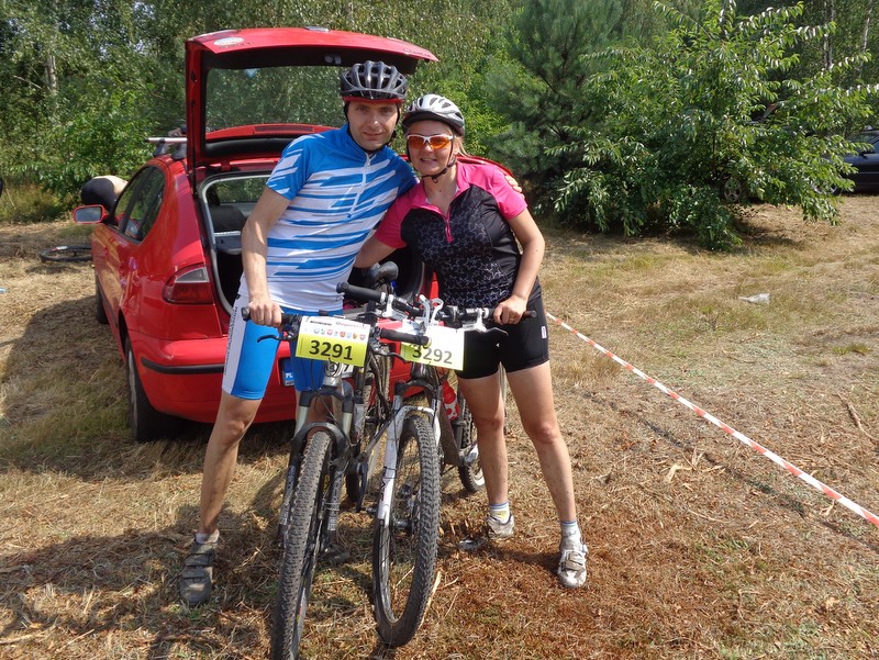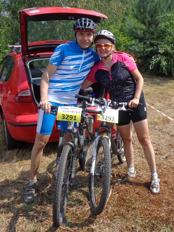 Z uwagi na upały, które w zeszłym tygodniu dochodziły do 40 stopni, raczej byliśmy sceptycznie nastawieni nawet do treningów, nie mówiąc o wyścigach, ale pogoda zmieniła się raptownie w niedzielę. Obudziliśmy się rano i spojrzeliśmy na termometr, który wskazywał 19 stopni. Słońce było za chmurami. Sprawdziliśmy prognozy na portalach i ostatecznie zdecydowaliśmy się pojechać do Poznania. Tym razem Pawełek zrezygnował dla mnie z rywalizacji w swojej kategorii. Nie znaliśmy trasy, więc obawiałam się jej trudów :( Pawełek po pierwsze wspierał mnie psychicznie, bo przecież nic mi się nie mogło stać złego przy mężu :), a po drugie, w kilku miejscach bardzo mnie pociągnął za sobą i dzięki temu ostatecznie uzyskałam bardzo dobry wynik. Także gratulacje należą się nam wspólnie za ten wyścig.