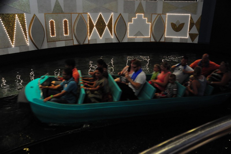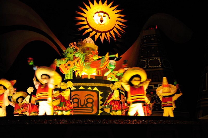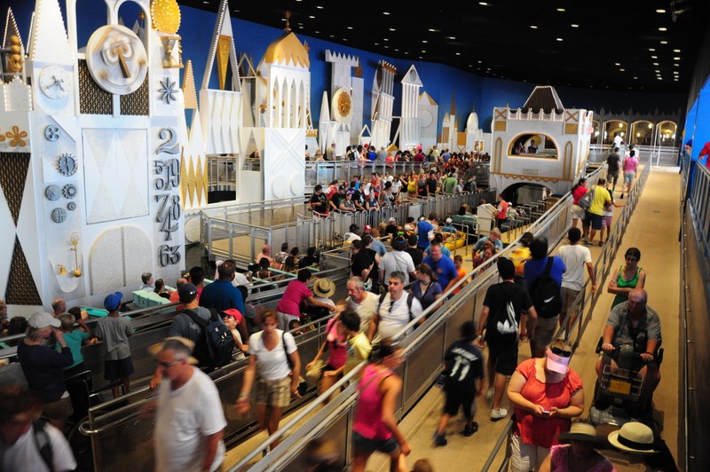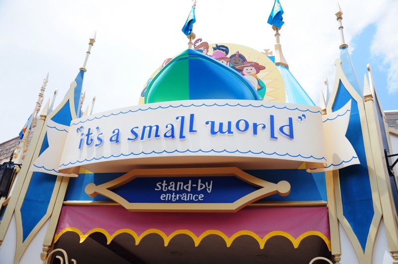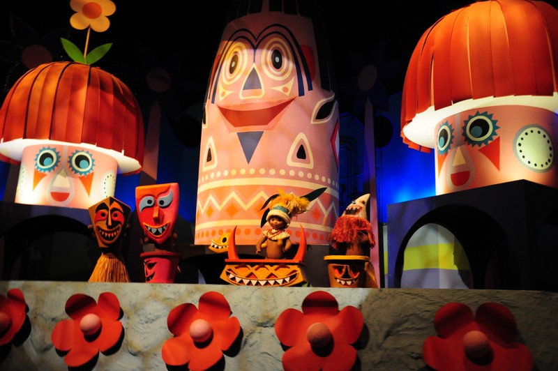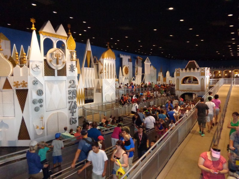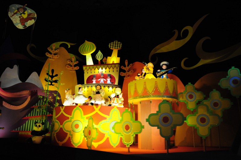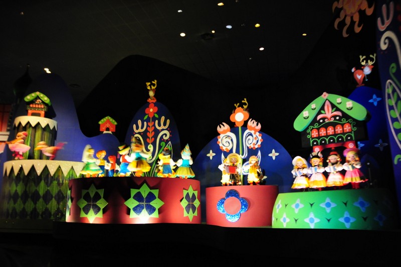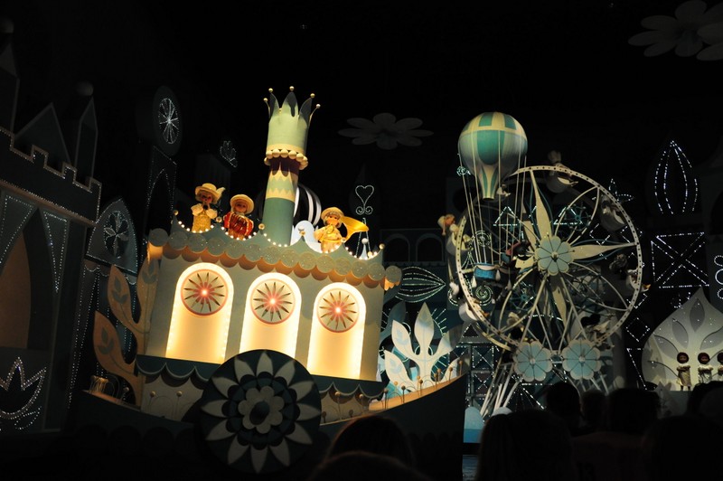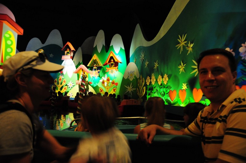 W Fantasyland za każdym razem jak jesteśmy to idziemy do „It’s a small world” – to taka prezentacja rożnych stron świata, kultur przez tańczące, poruszające się i śpiewające laleczki. Dziewczynki uwielbiają to, ja też, Paweł podobno też, siostra i Dawid też, więc chyba warto tutaj zajrzeć. W „Shreku” pamiętamy jak Osioł z Shrekiem docierają do zamku Duloc, tam witają ich takie laleczki, to właśnie te laleczki z Disneylandu i raczej autor filmu troszkę się z tego naśmiewa, ale my lubimy „it’s a small world” i zachęcamy do obejrzenia. Płynie się wewnątrz budynku i w przyciemnionym świetle spogląda na kolejne postacie śpiewające piosenkę ” It’s a small world”, tak że po wyjściu jest na tyle utrwalona, że już umiesz ją na pamięć.