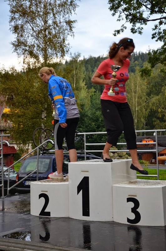 Jazda w górach jest czymś zupełnie innym niż po płaskim, jak się okazało na Maratonie „Liczyrzepa” w Karpaczu. To było moje nowe doświadczenie w maratonach rowerowych, a dla Pawełka, jedynie spokojny trening. Jako typowy „góral” (ma na swoim koncie sukces w „Klasyku Kłodzkim” – drugie miejsce w kategorii OPEN), wprost śmigał pod górkę i pewnie gdyby nie mój oddech z tyłu, poleciałby jak na skrzydłach. :) Wracając jednak do „Liczyrzepy”… otoczenie gór, śliczne widoki, już w połowie rekompensują wkładany wysiłek, a po drugie, po mozolnych wjazdach, następują szybkie zjazdy i „wiatr we włosach”. Miałam obawy, że nie dam rady przejechać wzniesień, ale się udało. Do pokonania było 60km. Przejechaliśmy cały dystans razem w 2 godz i 35minut więc w podobnym czasie co 58km maraton po płaskim dookoła Miedwia. Zmęczenie jednak było tutaj dużo mniejsze i na pewno zostawiliśmy sobie jeszcze trochę zapasu sił, dlatego w następnym roku liczymy na lepszy wynik.