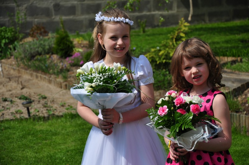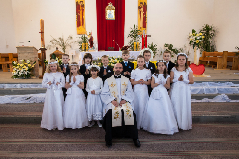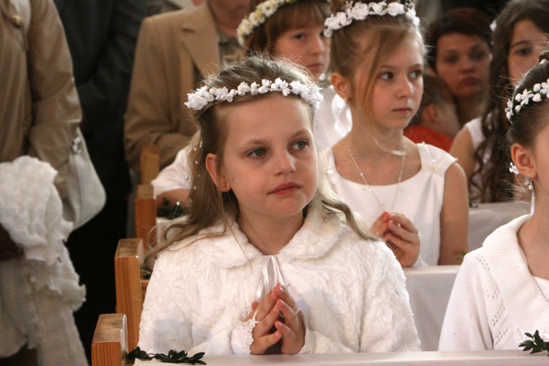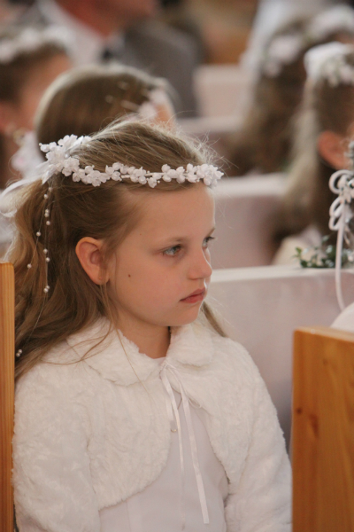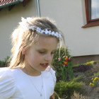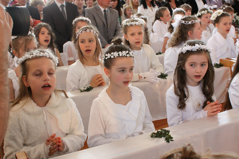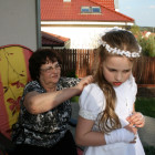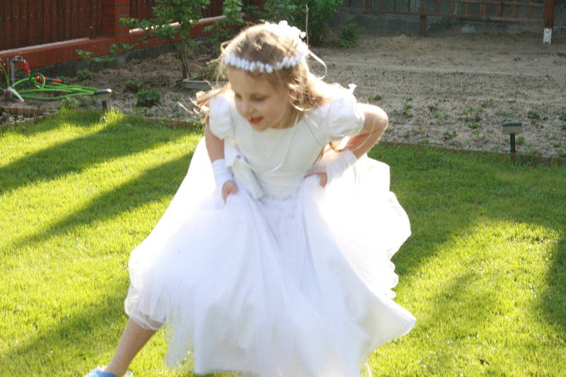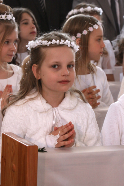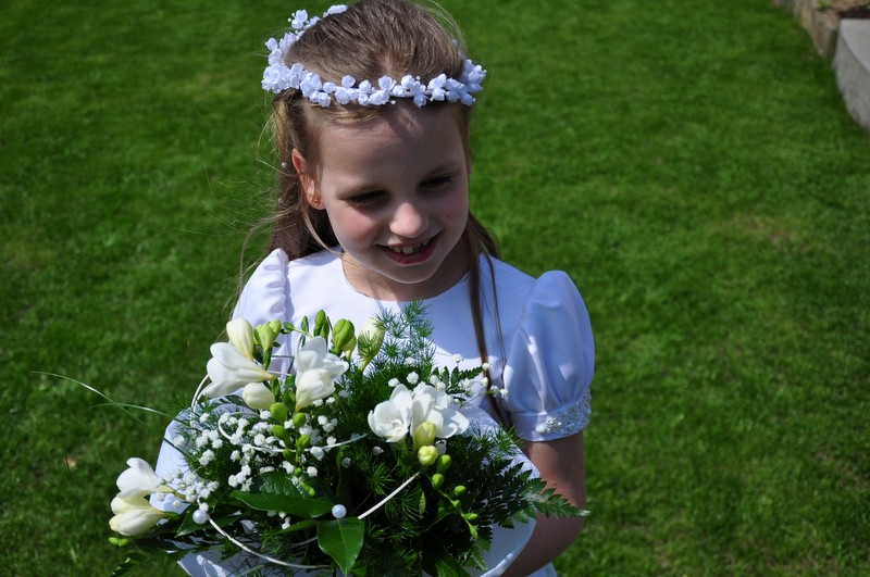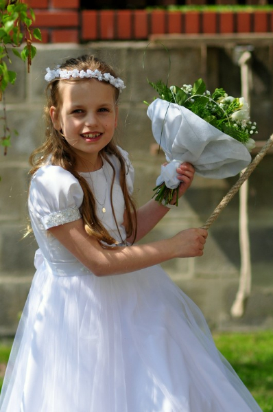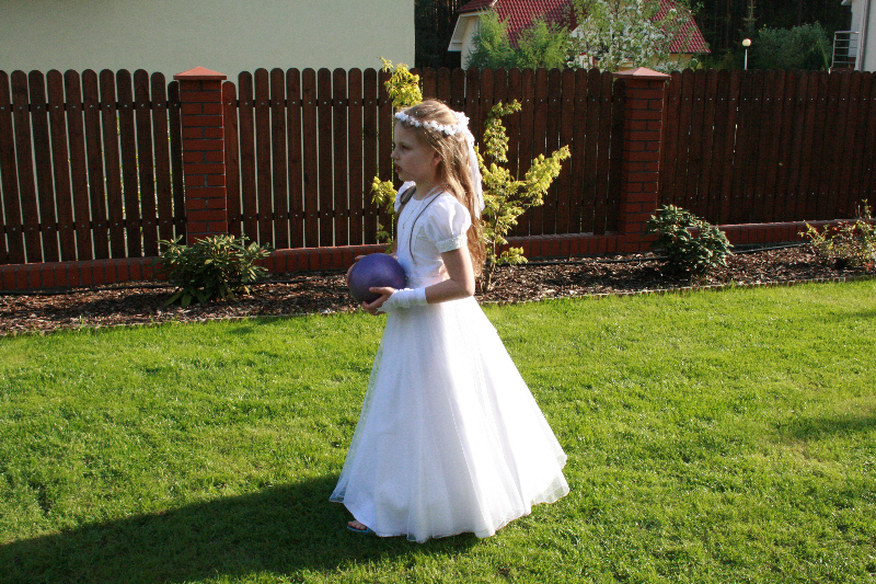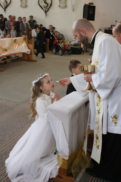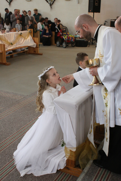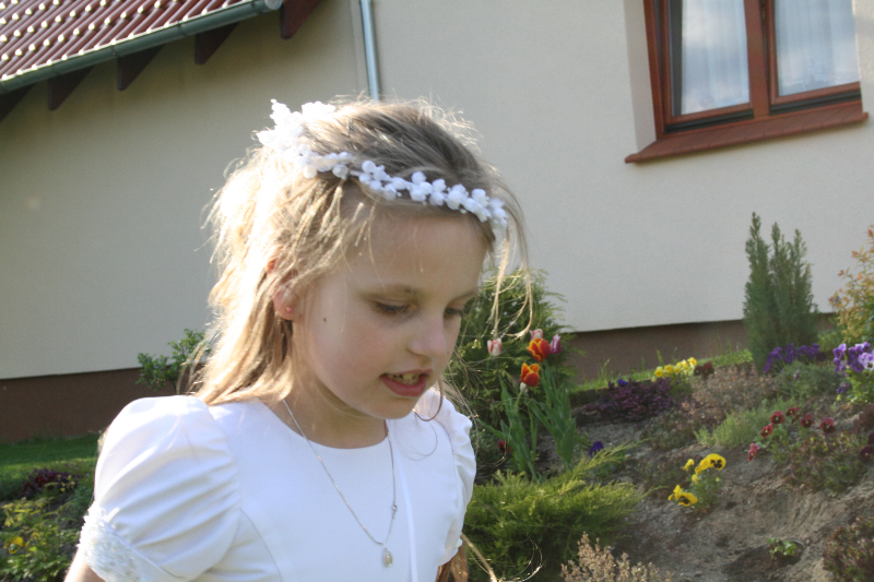 5 maja, w niedzielny poranek, o godz. 10:00 w Kościele Matki Bożej Nieustającej Pomocy nasza kochana córeczka Marlenka po raz pierwszy przyjęła do serca Pana Jezusa w sakramencie Eucharystii pod postacią opłatka komunijnego. Był to dla Marlenki bardzo ważny i wyczekiwany moment, do którego przygotowywała się od roku na mszach niedzielnych, na lekcjach religii, próbach oraz w domu po przez wspólne rozmowy, czytanie tekstów bibilijnych oraz poznawanie nauki Jezusa Chrystusa. Marlenka, jak nam powiedziała, chce być uczniem Wielkiego Nauczyciela, a Komunia Św. ją do tego pięknie przybliżyła, co nas bardzo cieszy.