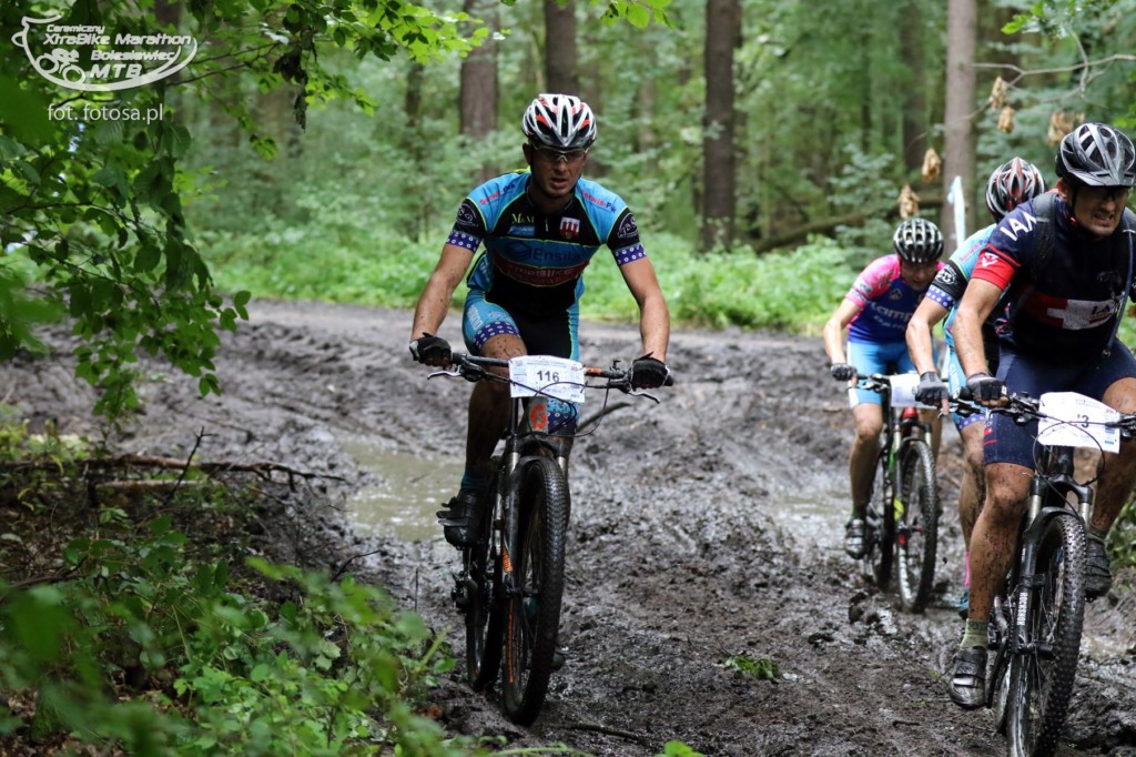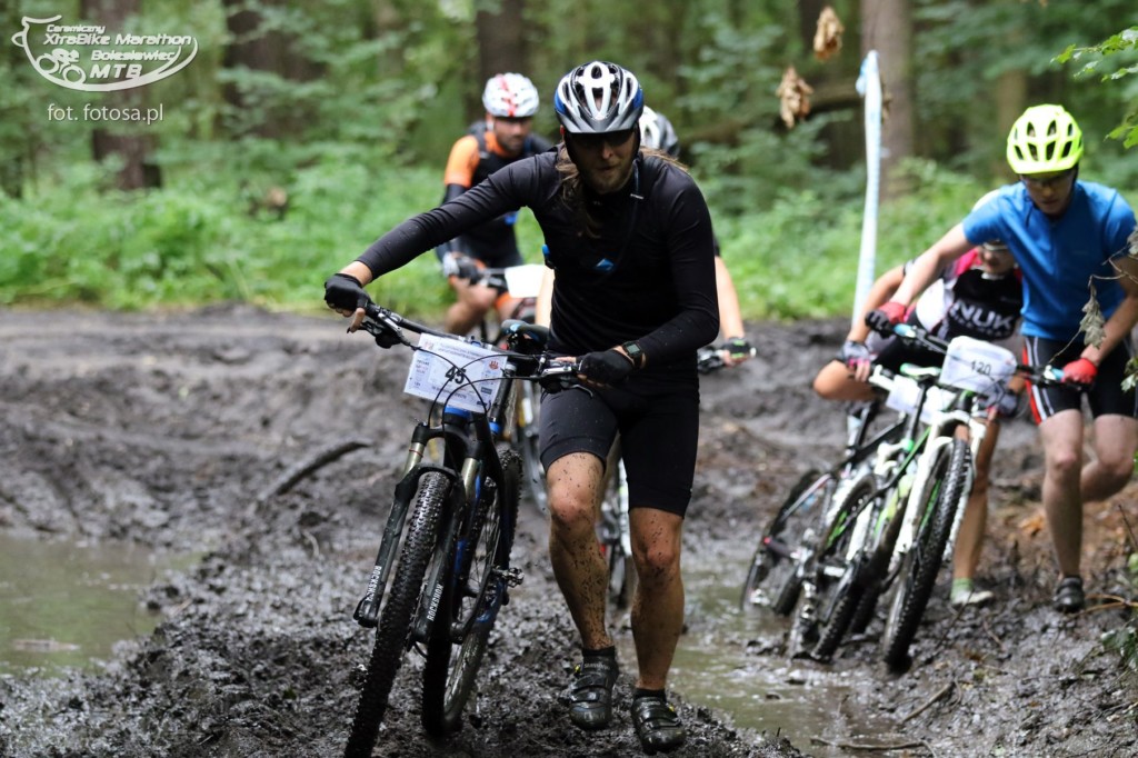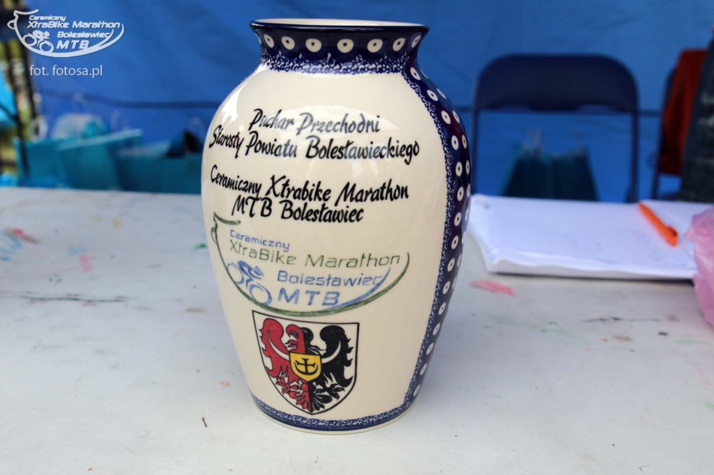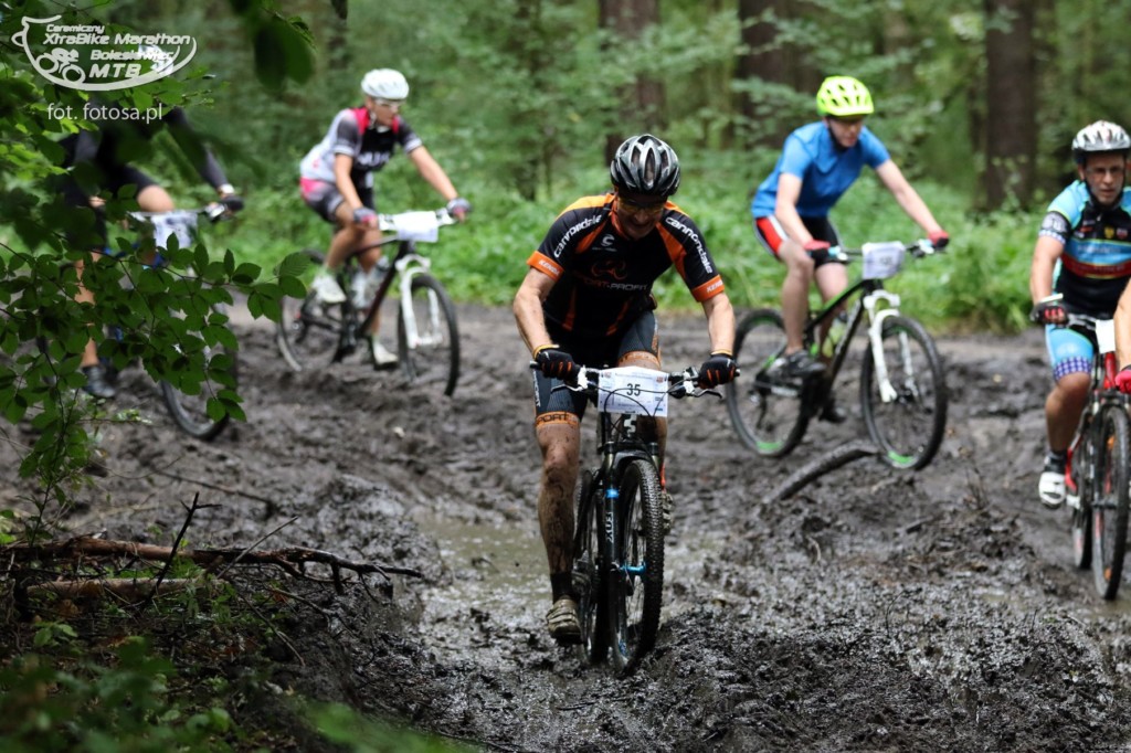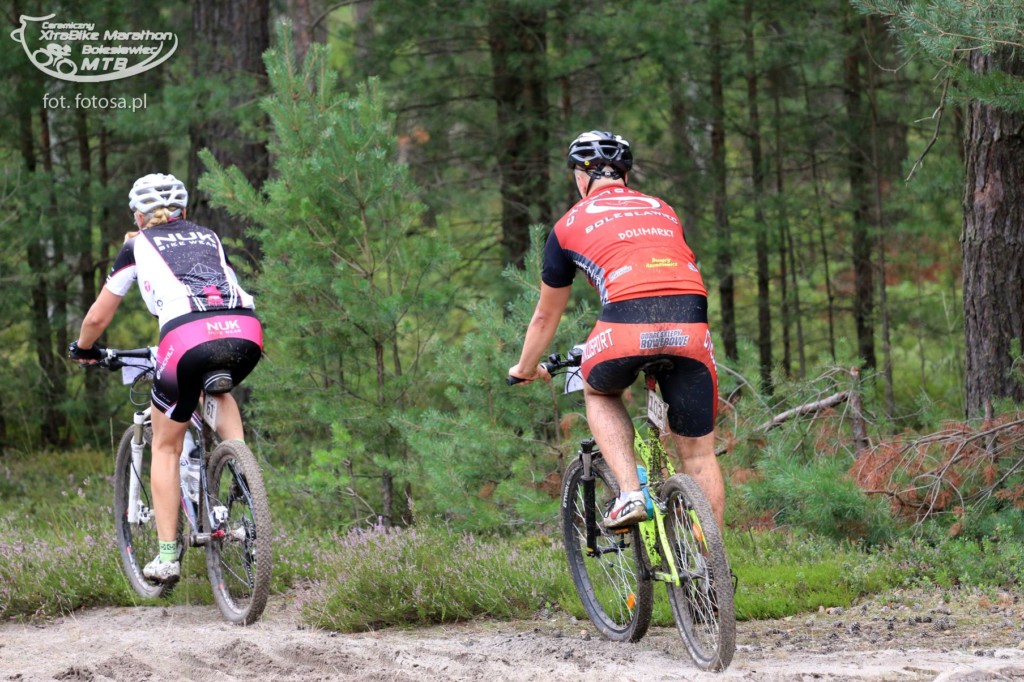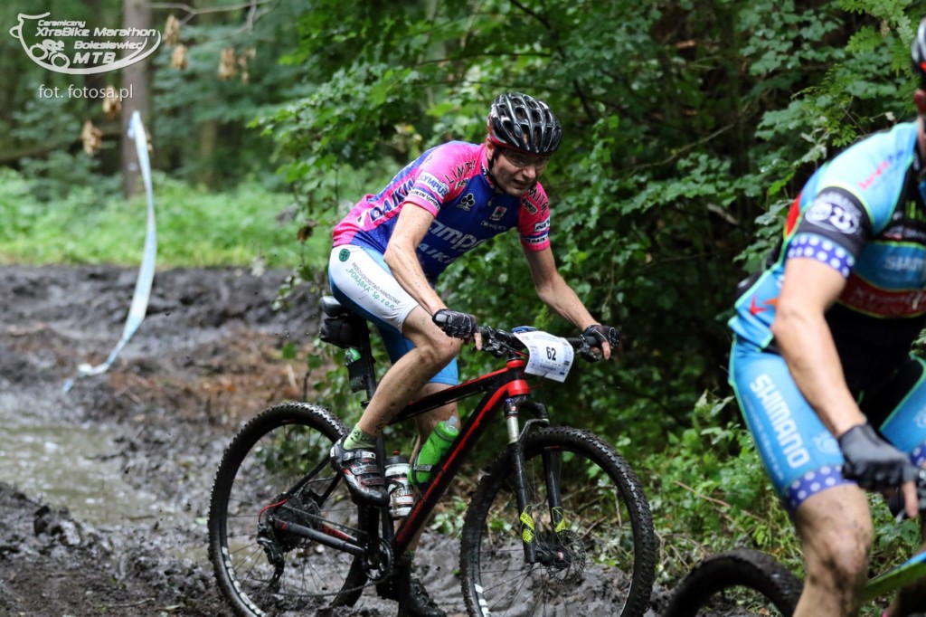 Po długiej, 2,5-miesięcznej przerwie od ostatniego maratonu jest okazja uczestniczyć w wyścigu rowerowym MTB w Bolesławcu. Sponsorem maratonu jest Ceramika Bolesławiec, fabryka której wyroby urzekają ręcznie malowaną stylistyką i tradycyjnym, ludowym klimatem. Firma przygotowała dla wszystkich uczestników piękne pamiątkowe porcelanowe medale, a dla zwycięzców porcelanowy puchar. Choć wyścig nie należał do prestiżowych, a uczestników nie było zbyt wielu (około 120), okazał się dla nas bardzo ciekawy. Oczywiście medale nas bardzo ucieszyły, ale jeszcze ciekawsza była trasa. Po ostatnich ulewach ścieżki leśne były błotniste i pełne kałuż, a w niektórych miejscach trawiastych, nasiąknięte jak gąbka. Nie można było uniknąć kompletnego obłocenia roweru, który już od początku rzęził. Trasa była przez to uciążliwa i ciężka. Dla Pawła nie stanowiła zaskoczenia, ponieważ w takich warunkach wielokrotnie pokonywał trasy wyścigów, ale dla mnie były to zupełnie nowe warunki. Oboje przyjechaliśmy ubłoceni, przy czym Paweł kąpiel błotną zaliczył w pełni jak widać na zdjęciach. Mycie rowerów i pranie ręczne ubrań zajęło nam niemal tyle samo czasu co wyścig ;-)