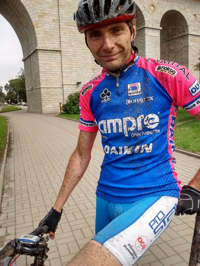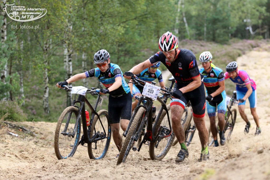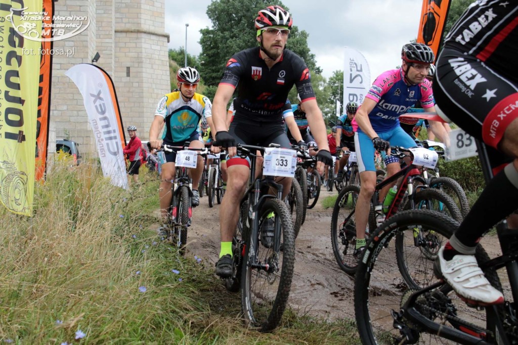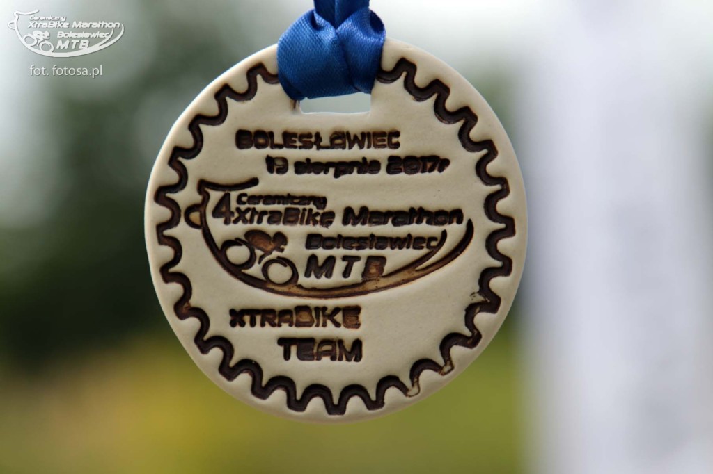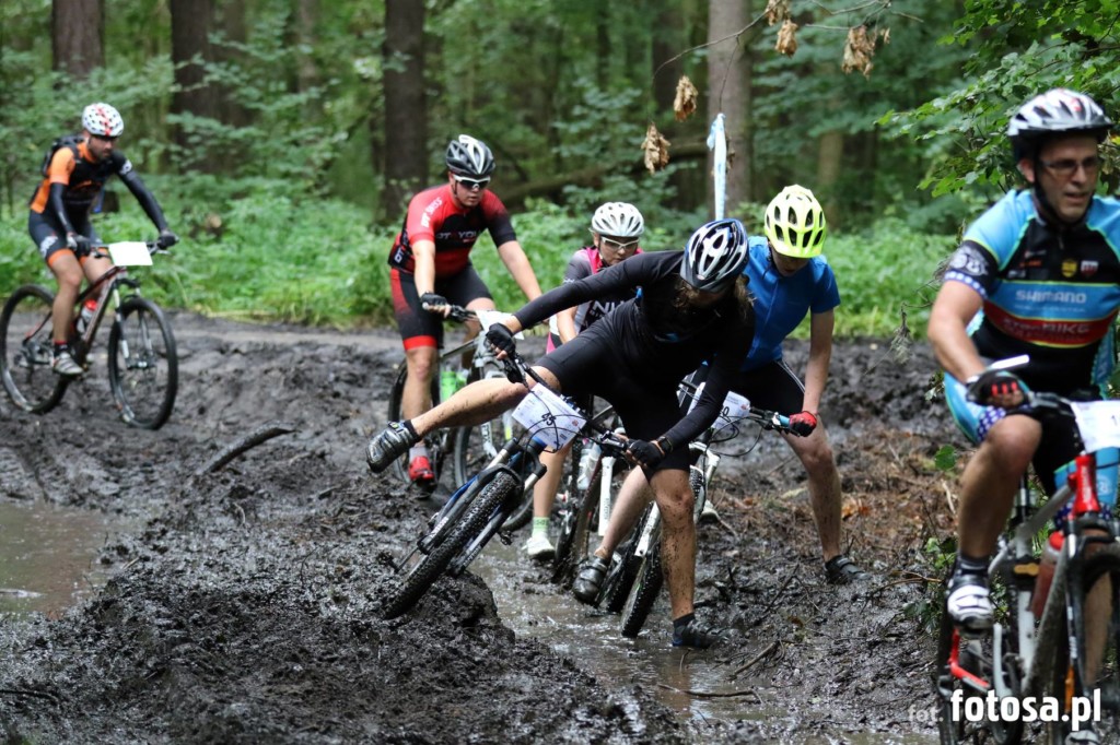 Po długiej, 2,5-miesięcznej przerwie od ostatniego maratonu jest okazja uczestniczyć w wyścigu rowerowym MTB w Bolesławcu. Sponsorem maratonu jest Ceramika Bolesławiec, fabryka której wyroby urzekają ręcznie malowaną stylistyką i tradycyjnym, ludowym klimatem. Firma przygotowała dla wszystkich uczestników piękne pamiątkowe porcelanowe medale, a dla zwycięzców porcelanowy puchar. Choć wyścig nie należał do prestiżowych, a uczestników nie było zbyt wielu (około 120), okazał się dla nas bardzo ciekawy. Oczywiście medale nas bardzo ucieszyły, ale jeszcze ciekawsza była trasa. Po ostatnich ulewach ścieżki leśne były błotniste i pełne kałuż, a w niektórych miejscach trawiastych, nasiąknięte jak gąbka. Nie można było uniknąć kompletnego obłocenia roweru, który już od początku rzęził. Trasa była przez to uciążliwa i ciężka. Dla Pawła nie stanowiła zaskoczenia, ponieważ w takich warunkach wielokrotnie pokonywał trasy wyścigów, ale dla mnie były to zupełnie nowe warunki. Oboje przyjechaliśmy ubłoceni, przy czym Paweł kąpiel błotną zaliczył w pełni jak widać na zdjęciach. Mycie rowerów i pranie ręczne ubrań zajęło nam niemal tyle samo czasu co wyścig ;-)