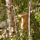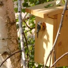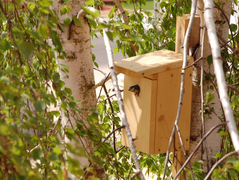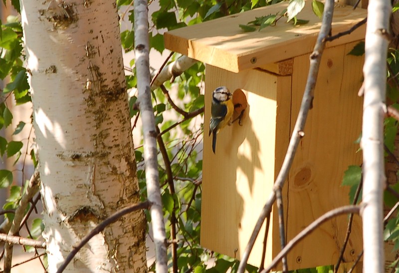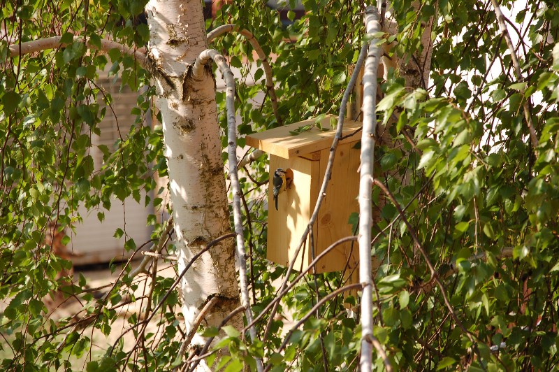 Pod koniec marca powiesiliśmy na brzózce budkę dla ptaszków, w nadziei, że jakaś ptasia rodzinką się nią zainteresuje. Po jakimś czasie zauważyliśmy sikorki modre, które coraz odważniej zaczęły się zbliżać do budki. Wreszcie się przekonały i ostatecznie wprowadziły. Mogliśmy obserwować jak znoszą tam różne źdźbła, piórka itp., potrzebne do budowy gniazdka. W tej chwili modraszki zadomowiły się już na dobre i prawdopodobnie wkrótce usłyszymy piskliwy głosik wciąż głodnych maluszków. A tych maluszków może być nawet kilkanaście! Niecierpliwie czekamy. :)