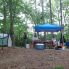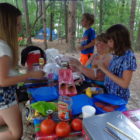 Naszą wyprawę na camping rozpoczynamy wielkim pakowaniem. W dwóch samochodach mieścimy dosłownie cały dom. Jest namiot sześcioosobowy, każdy ma swój materac i śpiwór, do tego kuchnia: gazowa, dwie duże lodówki, stolik, namiot i dużo jedzenia. W okolicach nie ma żadnego sklepu. W samochodzie mieszczą się też dwie hulajnogi, materace i inne akcesoria do pływania. W końcu ruszamy przedzierając się przez zatłoczoną autostradę. Docieramy do Jeziora Jaccosse już popołudniu. Jest upalnie, wilgotno i absolutna cisza. Camping mamy na dosłownie na cyplu jeziora. Rozkładanie obozowiska zajmuje nam dwie godziny. Upał i do tego zimny napój okazuje się, że akurat dla mnie nie jest dobrym pomysłem. Następnego dnia czuję piekące gardło i tak w konsekwencji cały wyjazd leczę chore gardło. Podczas gdy wspólnie z Anią stawiamy namiot, dzieci z Dawidem chłodzą się w jeziorze. Wieczorem nad jeziorem dołączamy do wszystkich. Są z nami Ciocia Triscia, kuzyn Joseh z żoną Dallas, przyjaciel Berto i kuzyn Nate. Tego dnia burza wisiała w powietrzu. otoczeni lasem nie widzieliśmy jak naciągnęły ciemne chmury. Nagle zerwał się wiatr i drzewa zaczęły uginać się niebezpiecznie, małe gałęzie zaczęły spadać koło nas. Grzmiało dosłownie nad nami. Schroniliśmy się w murowanym pomieszczeniu, dzieci były przerażone. Burza jednak szybko przeszła, a po nie zostało przyjemne, orzeźwiające powietrze. Kolację zjedliśmy z prawdziwą ochotą, choć w pośpiechu ponieważ nadal kropiło.