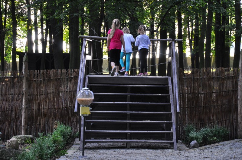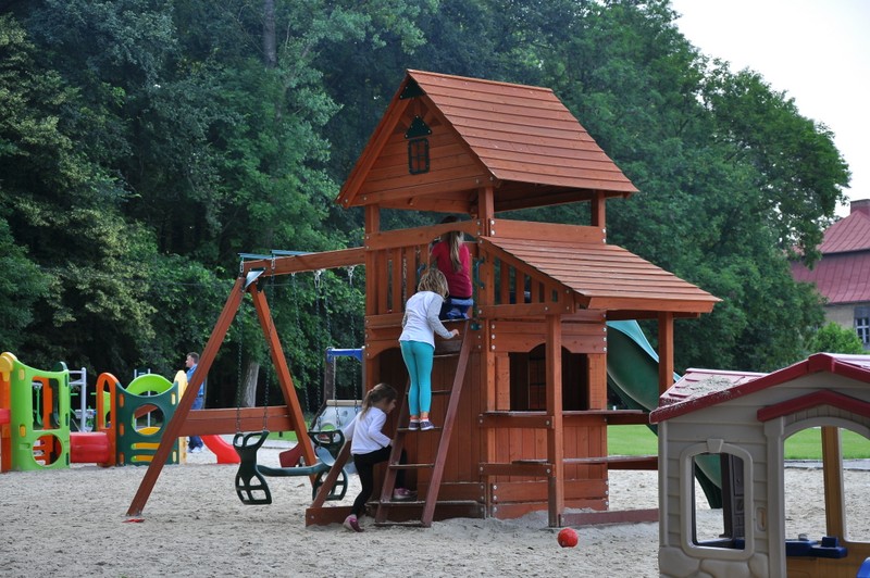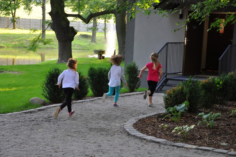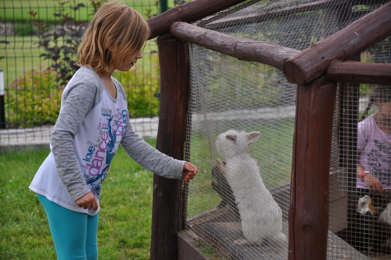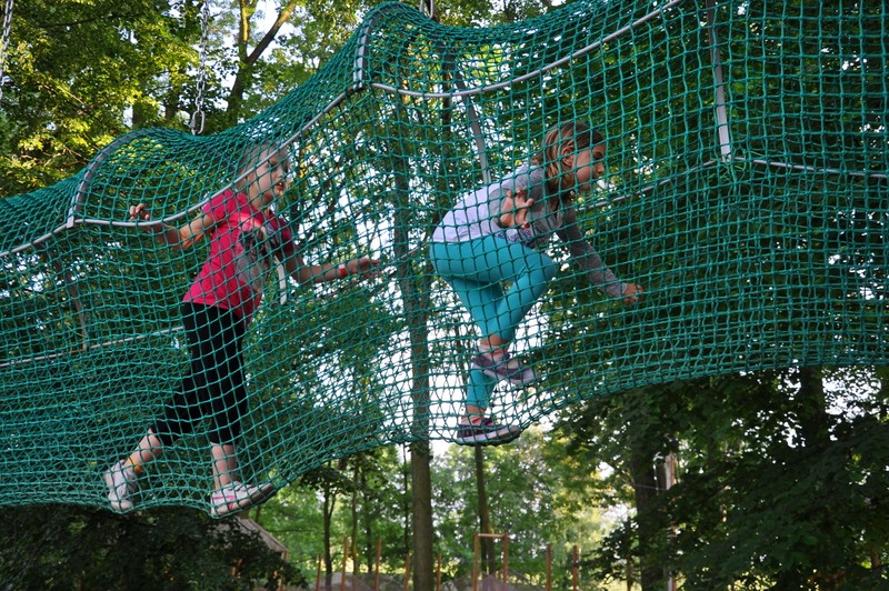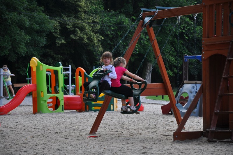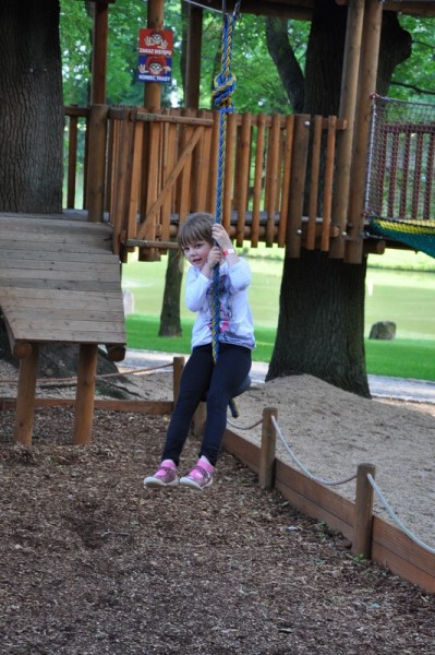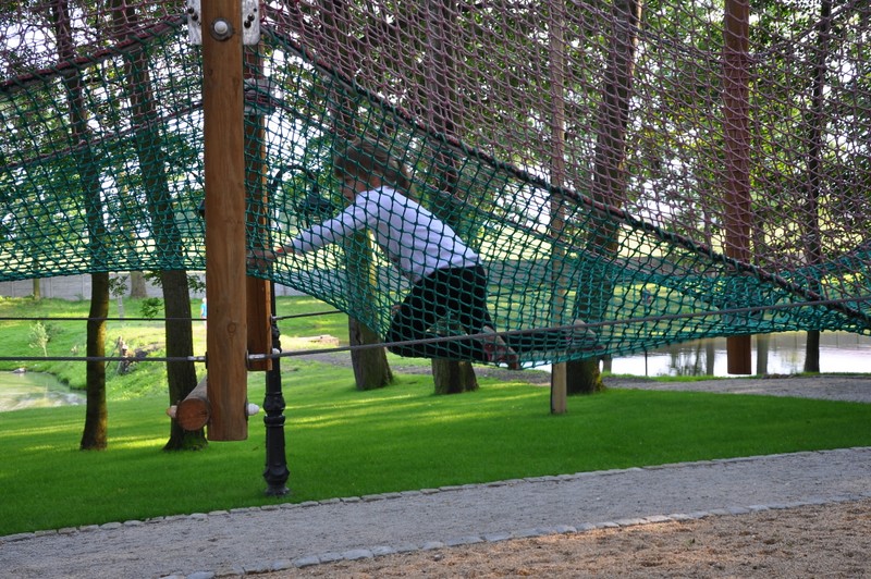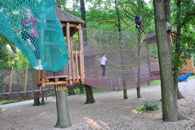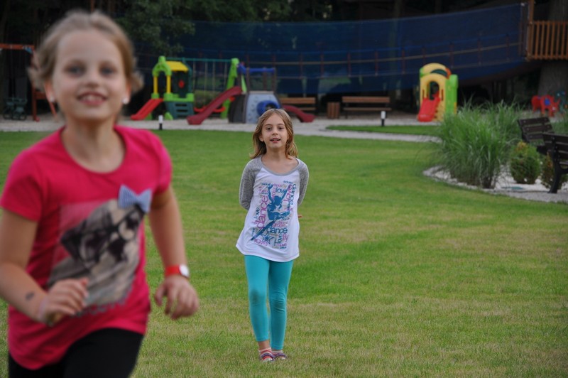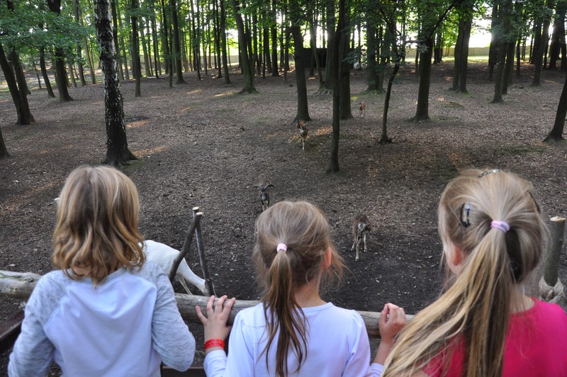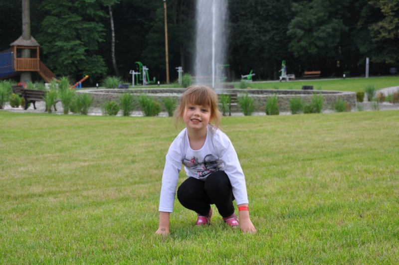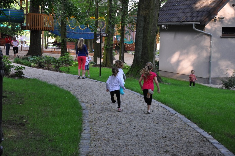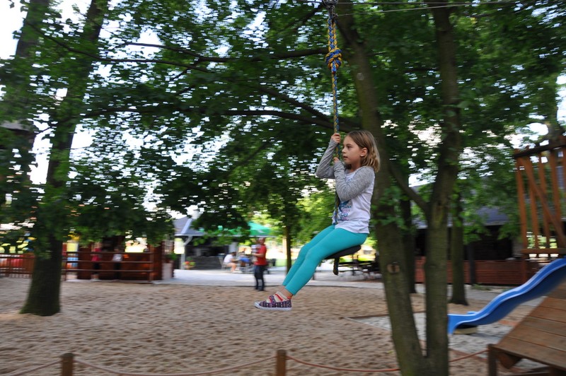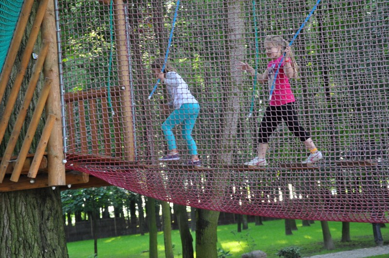 Niedaleko Tarnowskich Gór, w Zbrosławicach, znajduje się fantastyczne miejsce do zabawy dla dzieci. Tam też wybraliśmy się podczas krótkiej wizyty u rodziców razem z kuzynką Zosią. W sympatycznym miejscu wśród drzew został utworzony park linowy dostępny dla dzieci już od wieku przedszkolnego. Dziewczyny dosłownie „śmigały” na rozwieszonych kładkach, podtrzymując się linek. Patrzyliśmy na nie z dumą, że są takie odważne i sprawne.  Karmiliśmy też zwierzęta leśne: sarny, jelenie oraz króliczki, świnki, ptaszki w „małym zwierzyńcu” oraz w zamkniętym leśnym „mini rezerwacie”.  Dziewczyny często też tam miały okazję się bawić na sali zabaw, podczas deszczowych dni na tegorocznych wakacjach u dziadków. Wówczas na salę już jeździła z nimi babcia Marylka i dziadek Olek.