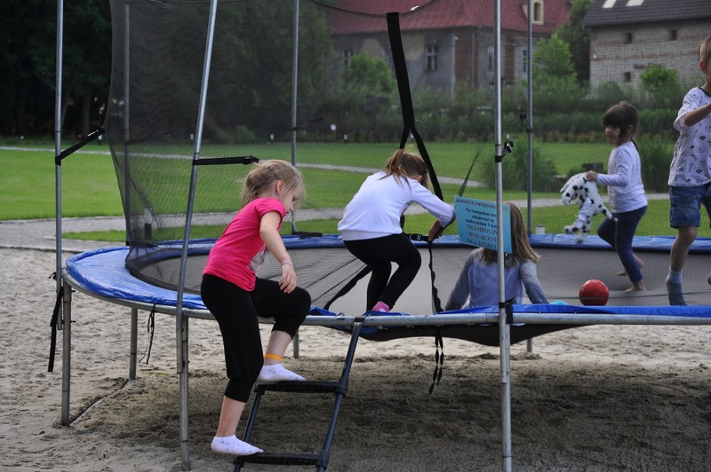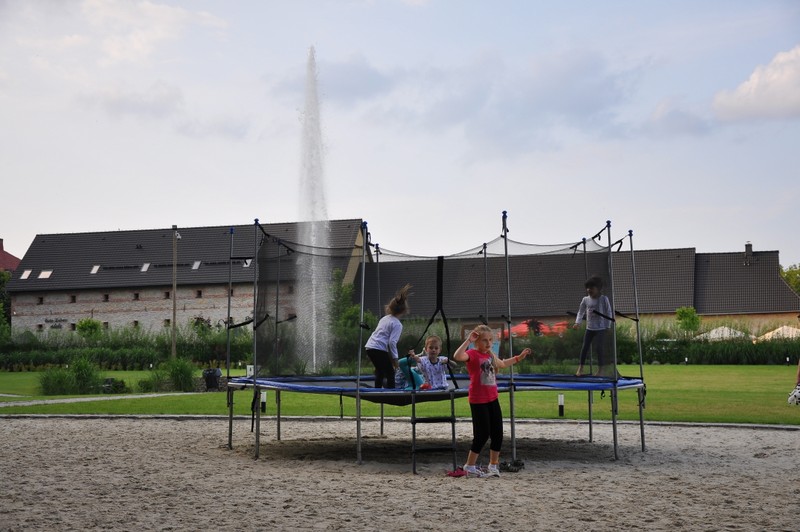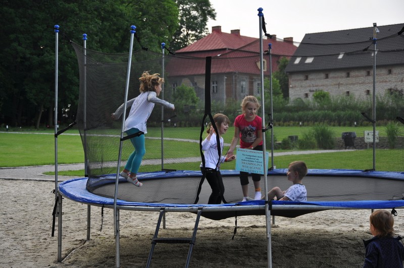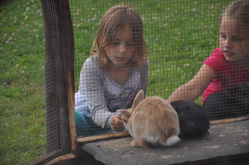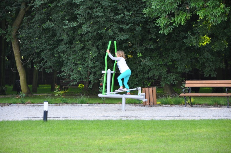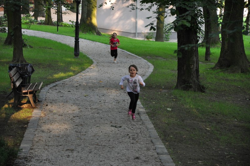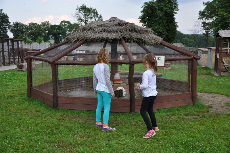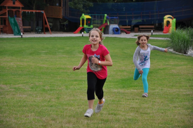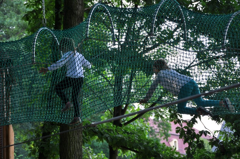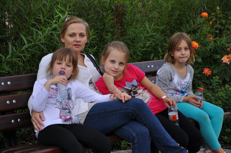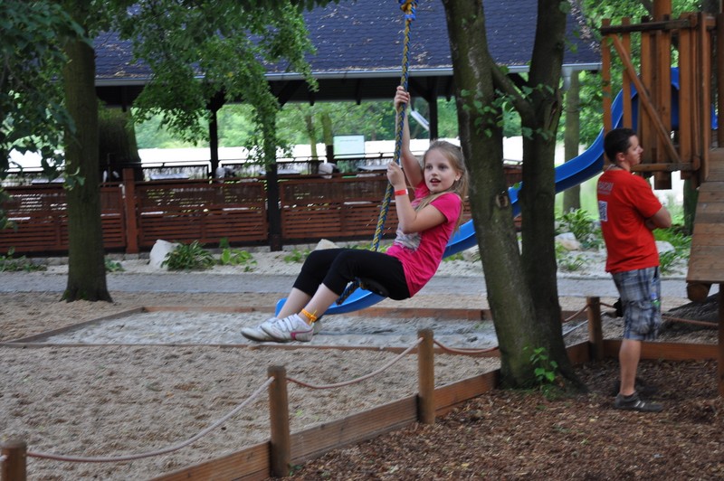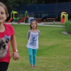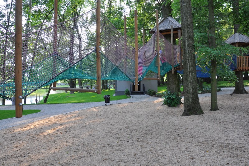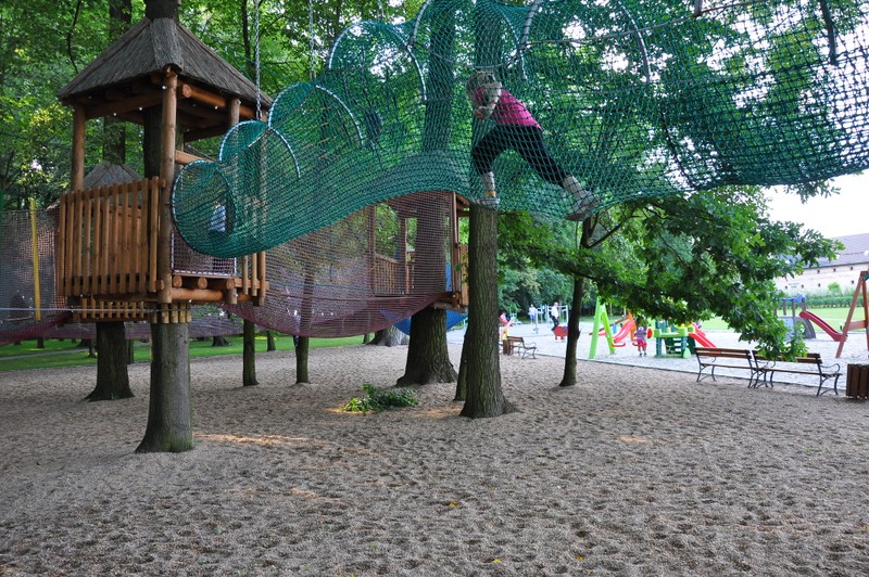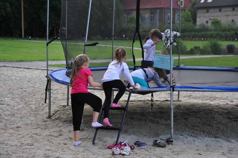 Niedaleko Tarnowskich Gór, w Zbrosławicach, znajduje się fantastyczne miejsce do zabawy dla dzieci. Tam też wybraliśmy się podczas krótkiej wizyty u rodziców razem z kuzynką Zosią. W sympatycznym miejscu wśród drzew został utworzony park linowy dostępny dla dzieci już od wieku przedszkolnego. Dziewczyny dosłownie „śmigały” na rozwieszonych kładkach, podtrzymując się linek. Patrzyliśmy na nie z dumą, że są takie odważne i sprawne.  Karmiliśmy też zwierzęta leśne: sarny, jelenie oraz króliczki, świnki, ptaszki w „małym zwierzyńcu” oraz w zamkniętym leśnym „mini rezerwacie”.  Dziewczyny często też tam miały okazję się bawić na sali zabaw, podczas deszczowych dni na tegorocznych wakacjach u dziadków. Wówczas na salę już jeździła z nimi babcia Marylka i dziadek Olek.