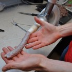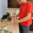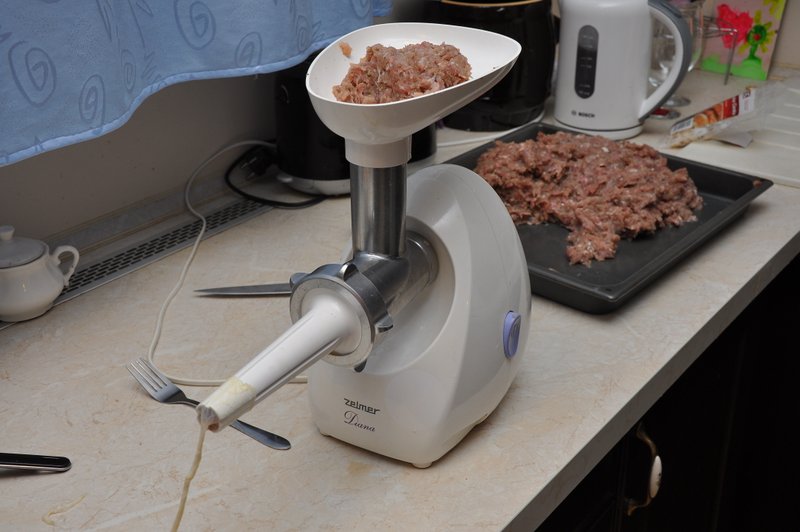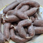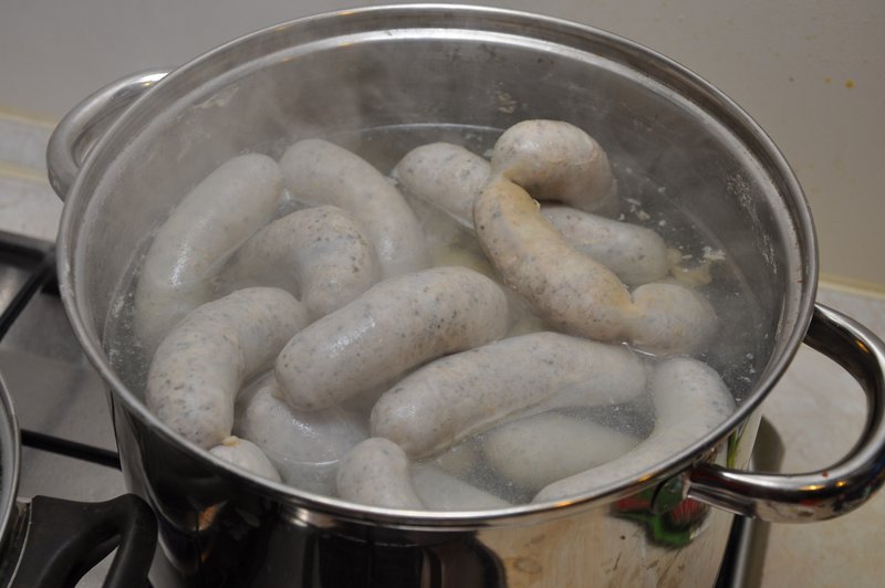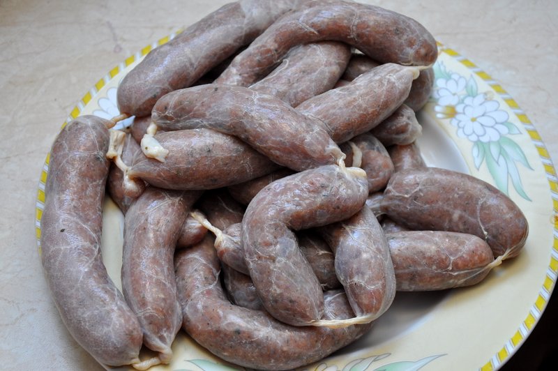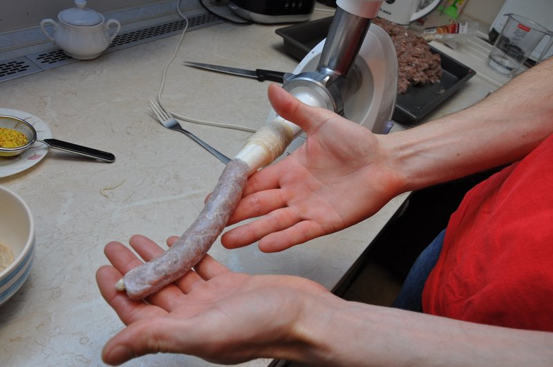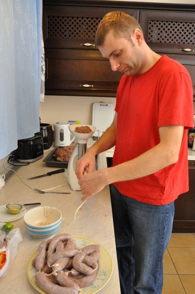 Produkcja domowa kiełbasek była absolutnie przedsięwzięciem spontanicznym i kiedy, już po wszystkim, spojrzeliśmy na ilość wytworzonego wyrobu, złapaliśmy się za głowę, ponieważ nie jesteśmy wybitnymi smakoszami białej kiełbasy, a okazało się, że mamy jej zapas na kilka miesięcy. :) Kiełbasa jest ze świeżego mięsa i bez tłuszczu. Próbujemy usilnie namówić na nią Julcię i Marlenkę, ale na razie bezskutecznie – z wyglądu nie jest parówką. :)