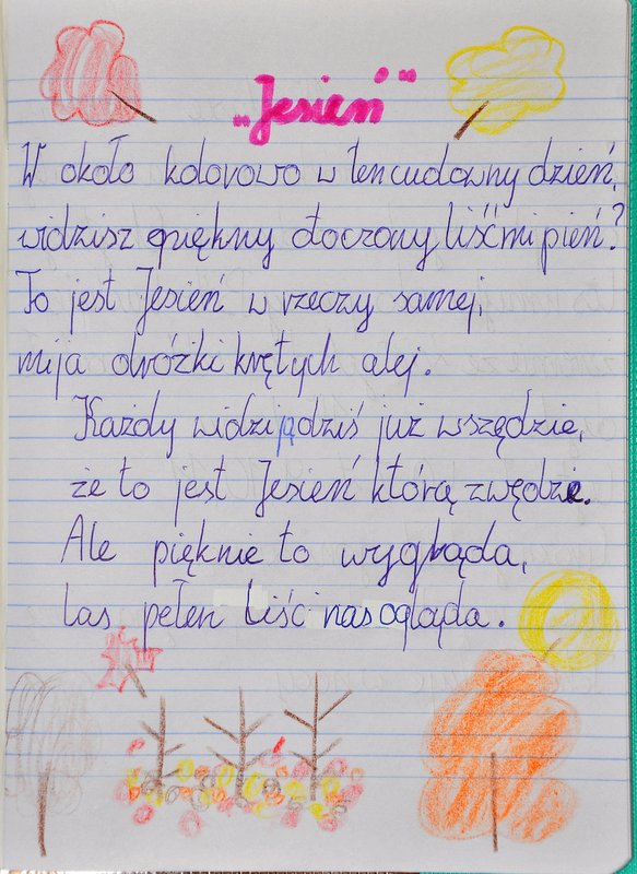 Marlenka zaskoczyła nas wierszem o jesieni i nie tylko nas, ale też Panią w szkole, która bardzo pochwaliła Marlenkę i stwierdziła, że gdyby w szkole były 7 postawiłaby za wiersz Marlence właśnie siódemkę. Troszkę jednak z niedowierzaniem pytała, czy aby na pewno Marlenka napisała wiersz samodzielnie. My wierzymy, że geny poetyckie ma po dziadku Olku, który piękne wiersze pisał… więc czekamy na kolejne wierszyki.
