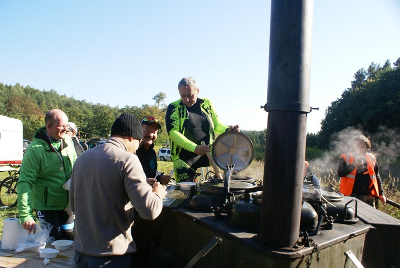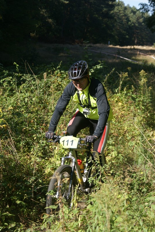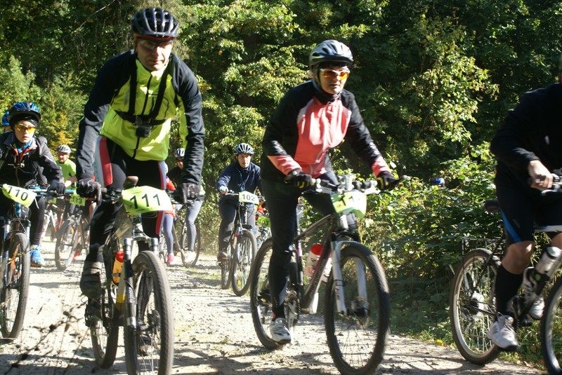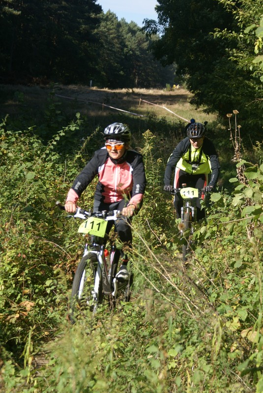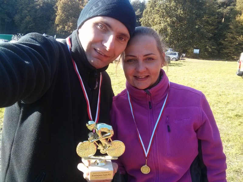 Pomimo niskiej już temperatury jak na początek października (7 stopni) zdecydowaliśmy się na udział w wyścigu par małżeńskich w Łupowie pod Gorzowem, a dokładnie niedaleko leśniczówki „Piotrówka” na trasie MTB o długości 15km. Główny wyścig miał formę duathlonu (trasa szosowa 23km + MTB 13km), ale ostatecznie nie zdecydowaliśmy się na udział w wyścigu głównym. Impreza miała charakter piknikowy, rodzinny. Od początku ogrzewaliśmy się przy ognisku, a po zawodach dostaliśmy na obiad żołnierską grochówkę, kiełbaski do pieczenia nad ogniskiem, a do popicia… piwo i nalewkę z miodu i cytryny. Impreza okazała się bardzo dobrym pomysłem na wolną sobotę. Obok par na tej samej trasie współzawodniczyły też pary rodzic+dziecko do 14 lat. Chłopaki byli fantastyczni, a dziewczynki też dały radę. Patrzyliśmy jak obok nas chłopak 12-13 letni walczył, próbując nas ścigać i ostatecznie na końcu nas wyprzedził. Mieliśmy też pecha na samym początku, ponieważ przy starcie jakiś cięższy Pan zahaczył o mój rower i oboje się wywróciliśmy. Na szczęście „poleciałam” jakoś na bok dalej od rowerów i poza zdenerwowaniem nie miałam nawet siniaka. Niestety uchwyt z przodu na bidon urwał się, róg od kierownicy lekko został nadszarpnięty. Kierownica się przestawiła, ale Pawełek szybko ją wyprostował. Pozostał do naprawy łańcuch, ponieważ tak nieszczęśliwie się zakleszczył, że w trójkę z organizatorami dopiero udało się go wyszarpać. Ten incydent na początku troszkę nas opóźnił, więc najszybsi już byli dawno z przodu, a nam pozostało ich gonić. Pawełek na trasie troszkę się nudził. Pary miały jechać razem, więc jechał moim tempem. Na nieszczęśliwego jednak nie wyglądał i dużo wciąż mówił do mnie, co akurat było dobre. Na metę dojechaliśmy jako druga para, Pierwsza para była przed nami niecałe 3 minuty wcześniej i jak nam się zwierzyli, z całej konkurencji najbardziej obawiali się właśnie nas :) Śmialiśmy się, że krążą o nas już „legendy”, które jednak szybko zdementowaliśmy. To nasze drugie miejsce nie było jakimś wybitnym osiągnięciem, ponieważ silne „pary” nie przyjechały, a młodzi chłopcy w wieku Marlenki nas wyprzedzali, ale była satysfakcja z miejsca na podium, na którym stanęliśmy razem. Może w następnym roku zdecydujemy się na duathlon.