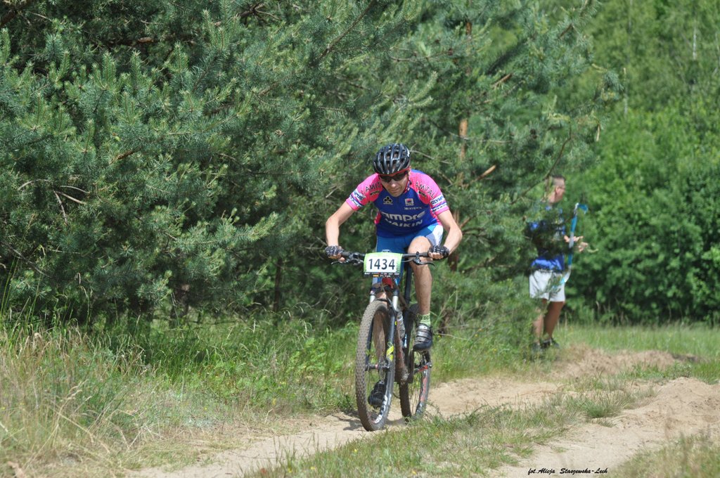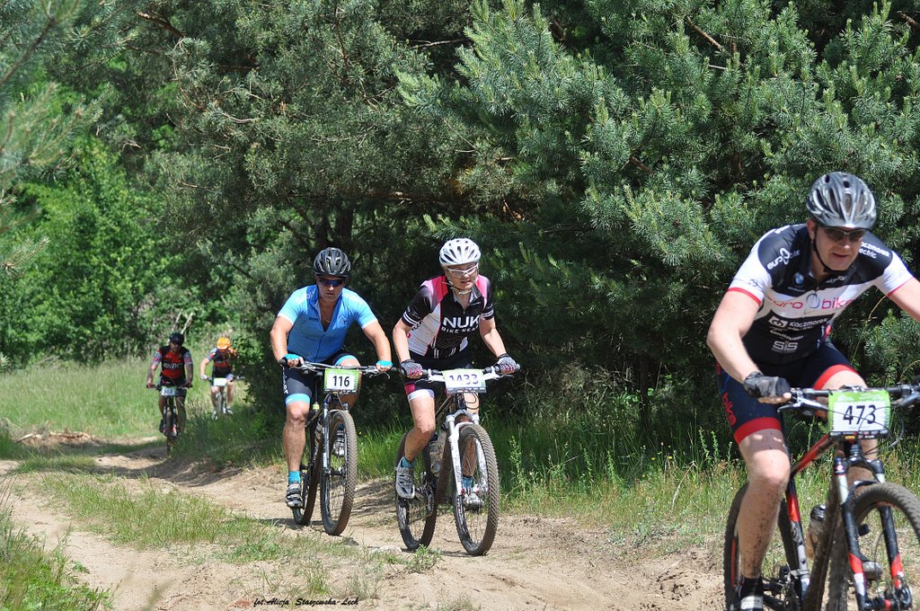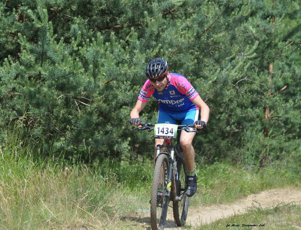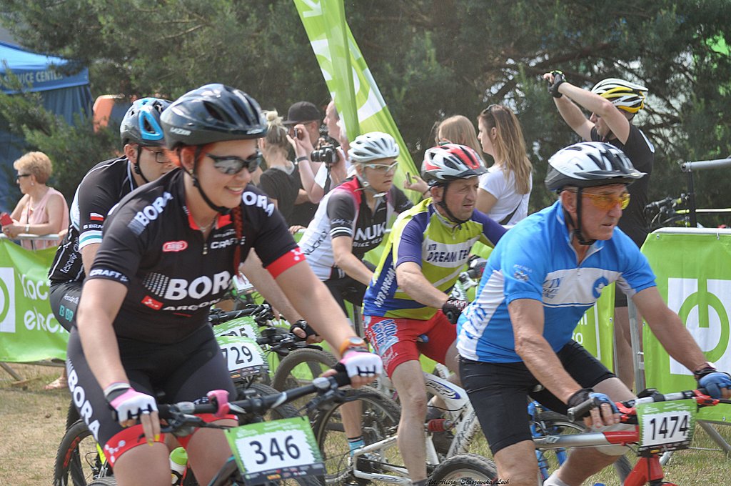 Dzisiaj uczestniczyliśmy w wyścigu rowerowym w Zielonej Górze. Wyścig odbył się w ramach cyklu maratonów MTB Kaczmarek Electric. Jak do tej pory edycje w Zielonej Górze były na tyle trudne, że nie decydowaliśmy się na uczestnictwo w nich (głównie z mojego powodu).Tym razem jednak trasa miała łagodniejszy profil i zdążyliśmy ją poznać przed wyścigiem, co ostatecznie utwierdziło nas w przekonaniu, że oboje damy sobie spokojnie radę. Do pokonania w terenie było 20km. Wystartowaliśmy z różnych sektorów: Paweł z 3, a ja z ostatniego 6. Dla wyjaśnienia wagi startu z sektora wyjaśnię, że start z poszczególnych sektorów odbywa się z odstępem dwuminutowym, a sektory te przydzielane są na podstawie dotychczasowych wyników w cyklu i mierzone stosunkiem czasu przyjazdu zwycięzcy (mężczyzny) do czasu osiągniętego przez zawodnika. Pawłowi udało się „przedrzeć” swoim wynikiem z Żar do 3 sektora i jechał z bardzo dobrymi, a ja pozostałam w 6. Zadanie miałam więc trudne, ponieważ to najliczniejszy sektor i bardzo zróżnicowany pod względem wytrenowania, techniki.